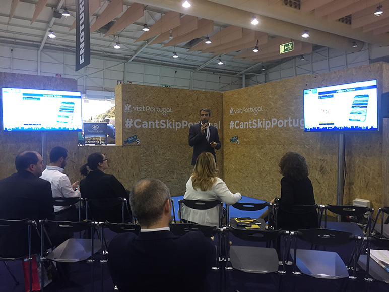 El profesor. Dr. Pedro Pereira, del Departamento de Ingeniería Eléctrica de FCT NOVA presenta en la Feria de Turismo de Lisboa, la aplicación para turistas desarrollada por FCT como parte de su participación en el proyecto Interreg SHCity.
